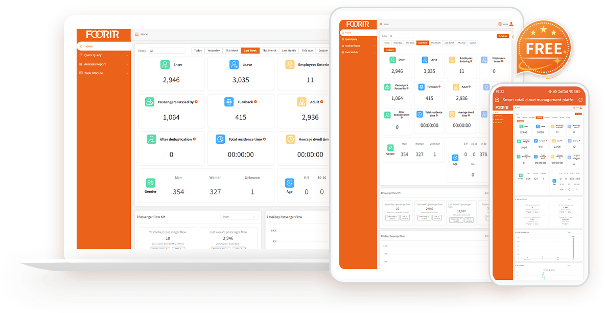 FOORIR’s 3D/AI smart sensors deliver 24/7 real-time counting (complex scenarios), cloud reports, SLA services and training.